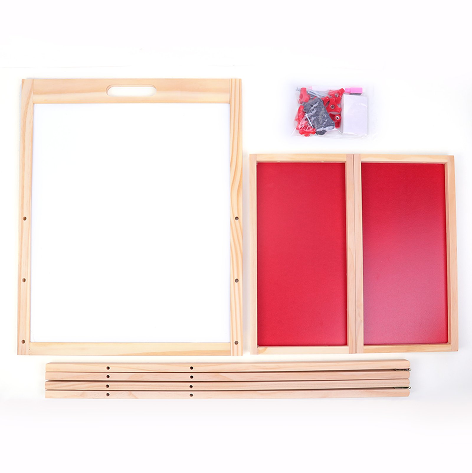 Material: High-quality natural pine wood frame with smooth finish, durable plastic trays, and high-grade chalkboard & dry-erase whiteboard surfaces
