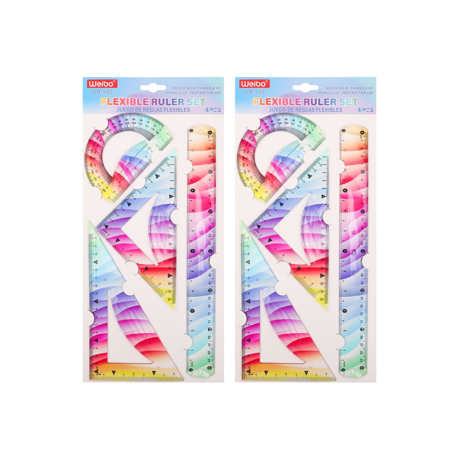 Weibo Flexible Ruler Set WB-542 – 4 Pieces Bendable Soft Geometry Kit with Rainbow Gradient Colors for Kids and Students