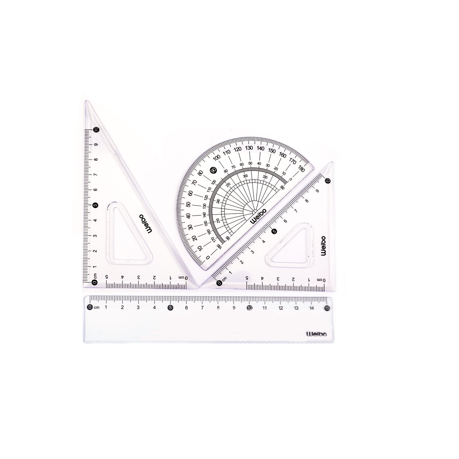 Weibo Student Geometry Ruler Set WB-511 – 4 Pieces Transparent Plastic Ruler Kit with Straight Ruler, Protractor and Triangles for School Drawing and Math